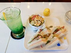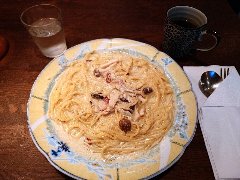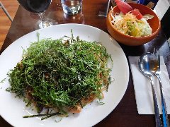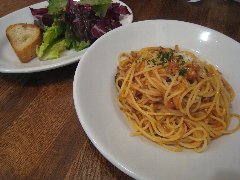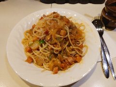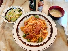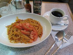 ![]() | 築地駅から4、5分、築地場外市場の狭い路地にあります。ビルの2階です。海産物のお店がぎっしり並んでいる間にこっそりと階段があります。店内は、テーブルが5つありました。小ぢんまりしています。黄緑の壁、昭和歌謡が流れます。窓からは通りが見えます。和風スパゲッティー(920円)とアイスコーヒー(+180円)を注文しました。サラダが付きます。パスタが見えないほどの大量の刻み大葉が乗っていました。パスタは海苔、ウインナー、椎茸などが入っていて、醤油ベースの味付けで少し焦げ目がありました。大葉が多いので少しモサっとしますがパスタ自体はつるつる行けます。結構大盛りでボリュームあります。コーヒーはシロップが入っていました。美味しかったです。他には、各種ドリンク、各種スパゲティ、スープスパゲティなどがありました。 |