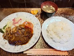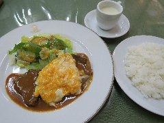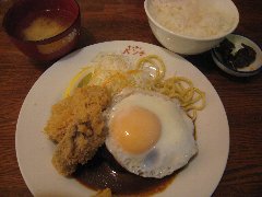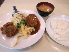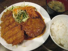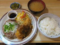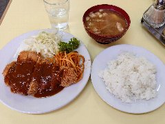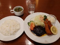 ![]() | 馬喰町駅から1分、清洲橋通り沿い、馬喰町の交差点の近くにあります。開店前に数名の行列が出来ていました。3階建ての1階、オレンジ色の壁の外観です。立て看板には創業1895年と書かれていました。店内は、カウンター席が2つ、テーブルが7つありましたが、入店人数を制限していました。清潔感があります。ハンバーグ定食(1100円)を注文しました。ご飯、味噌汁、漬物が付きます。ご飯は1回おかわり出来ます。ハンバーグは230gあって大きくて厚みもあります。デミソースがたっぷり掛かり合挽き肉と玉ねぎでふわっとした食感、上品な味わいです。とても美味しかったです。他には、とんかつ定食。メンツかつ定食、ソースかつ丼定食などがありました。 |