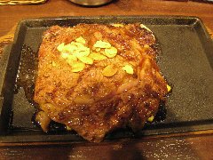 いきなり!ステーキ | ステーキ | 東京都中央区銀座 | ★★ (2014.10.12) | 普通 | ![]() | 有楽町駅から新橋方面に向かって5分ほどのところにあります。立ち食いのステーキ屋です。店に入るとカウンターに通され、先ずサイドメニューを聞かれます。良く分からず断ると、ライスもこの時点で注文するようでした。ステーキは焼き場の横まで行って注文します。リブロースは5.5円/グラム、サーロインは7円/グラムなど量で注文します。とりあえずリブロースを200グラムで注文しようとしたら、最低で300グラムとの事。リブロース300gを注文するとその場でカットし、肉は焼き場に回されます。切り売りなのでグラム数は半端になります。リブロース(327g)(1942円)とライス(216円)を注文しました。焼き方もその場で伝えます。後はカウンターで焼き上がるのを待ちます。ステーキは熱い鉄板の乗せて店員さんが運んでくれます。ステーキの上にはニンニクスライスが乗っていました。柔らかくて結構美味しいです。ガッツリ食べるのにはかなり安いと思います。因みに黒毛和牛リブロースは13円/グラムです。店内の客がみな立ってステーキを食べている光景はちょっと異様です。ほぼ満席でしたが回転は早いです。 |