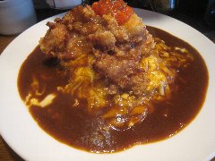 美味卵家 | 洋食 | 東京都千代田区鍛冶町 | ★ (2014.11.2) | 普通 | ![]() | 神田駅のすぐ近く、東口から15秒ほどのガード下にあります。うまたまや、と読みます。オムハヤシライス、オムライスがメインのお店です。店内はカウンター席が8つ、狭いです。全部のせオムハヤシB(1350円)を注文しました。注文するとすぐにスープが出されました。オムハヤシBには、オムハヤシライスの上に唐揚げ、チーズ、カニコロッケが乗っています。オムハヤシライスは、白米にケチャップソースを乗せ、その上にトロトロ卵焼きが乗り、さらにデミグラスソースがかかっています。カロリー満点の一品です。定食メニューもあります。 |
