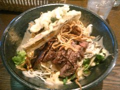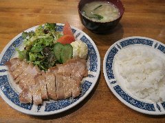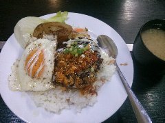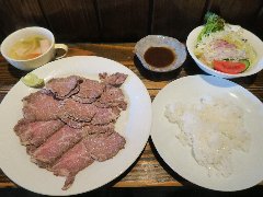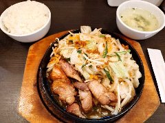 ★ (2015.12.24) | 普通 | ![]() | 立川駅南口から3分ほど、錦町一丁目西l交差点の近くにあります。ビルの2階にある鉄板焼きのお店です。店内は、カウンター席が8つ、テーブルが3つありました。ランチメニューから、(ありえへん世界グランプリメニュー?の)手作りラー油ハンバーグセット(750円)と目玉焼き(80円)を注文しました。大皿のご飯の上に、ハンバーグ、目玉焼き、焼いた玉ねぎ、生野菜が乗っていました。ハンバーグには手作りラー油、ニンニク、万能ネギ、マヨネーズが掛けてあります。美味しいですが結構味が濃いです。しかもランチのニンニクは要注意です。ライス、味噌汁がおかわり出来ます。他のランチメニューは、豚焼肉ラー油丼、和牛照焼ハンバーグ、トーフ肉玉ステーキ、黒毛和牛ステーキなど12種類、ソフトドリンクは+100円です。通常メニューは、鉄板焼き、ステーキ、お好み焼きなどがありました。 |
