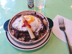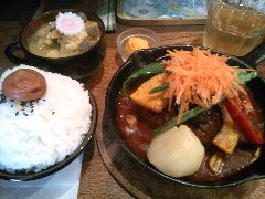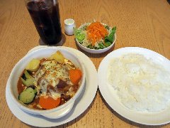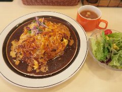 タケウチ | 洋食 | 東京都千代田区神田神保町 | ★★★ (2015.5.29) | 普通 | ![]() | 神保町駅から2、3分、駅の東北側の狭い路地にあります。赤いテントでガラス張りです。店内は、カウンター席が12ありました。煮込みハンバーグ(850円)を注文しました。デミソースかカレーソースを選べますが、デミにしました。煮込みハンバーグには、茄子、パプリカ、ジャガイモ、ピーマン、いんげん豆、ズッキーニ、千切り人参、などが入っていました。ソースはトマトのような酸味がありました。具だくさんで美味しいです。ご飯は、小ぶりの茶碗に山のように盛られ、梅干が乗っています。豚汁は、細かく刻んだ具が沢山入っています。カボチャのサラダも付いていました。ご飯と豚汁はおかわりできます。その他、海カレー膳、キーマ風カレー、スープカレー膳など、基本はカレーです。 |