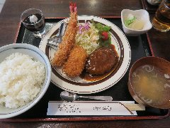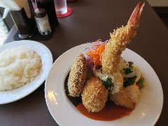 ![]() | 新小岩駅から3分ほど、駅前から延びるルミエール商店街から路地に入ったところにあります。ビルの1階です。レンガ風の壁の外観です。昭和10年創業の老舗です。外にメニューサンプルが出ていました。店内は、カウンター席が2つ、テーブルが6つありました。明るくてきれいです。盛り合わせセット(990円)を注文しました。ライス、味噌汁、漬物、デザートが付きます。エビフライ、カニクリームコロッケ、ハンバーグの盛り合わせです。エビは大きめ、ハンバーグはデミグラスソース、カニクリームコロッケは溶けるくらトロトロでした。美味しかったです。デザートはコーヒーゼリーでした。他には、トンカツ、オムライス、ビーフシチューなどがありました。 |