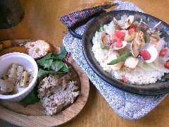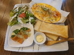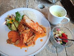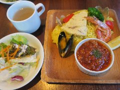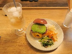 ![]() | 柴崎駅から2分ほど、駅の北側の住宅街にあります。2階建ての建物の1階です。庭の門から入ります。店内は、カウンター席が2つ、テーブルが3つ、テラスにテーブルが3つありました。ギャラリースペースもあります。窓からは庭に緑が見えます。音楽は小さめ、のんびりした雰囲気です。店員さんは女性2人でした。夜はバーとなるようです。ランチの洋プレート(850円)を注文しました。プレートは、しらすのキッシュ風チーズ焼き、スモークサーモンとブロッコリー、サラダ、トーストでした。体によさそうな優しい味でした。トーストはおかわりできます。美味しかったです。他には、和のお膳、タコライス、チキンマサラカレーなどがありました。 |