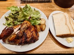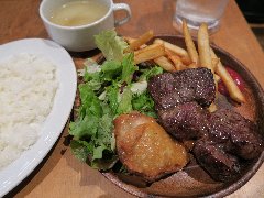 ![]() | 新日本橋駅から1分、ビルの地下にあります。地下の入口は駅に直結しています。店内はテーブルが多数ありました。かなり広いです。地下ですが吹き抜けの外階段もあるので割りと明るいです。お洒落な雰囲気です。お肉ランチ(1000円)を注文しました。ライス、サラダ、スープ、ドリンクが付きます。ライスは大盛り無料です。お肉ランチはワンプレート、低温でじっくり火入れした鶏むね肉のグリルきのこトマトクリームソースとライスとサラダが乗ります。鶏肉けっこう大きくて柔らかいです。別皿のサラダは数種類の野菜が角切りになっていました。野菜にはかなり拘っているようです。とても美味しかったです。この立地でこの内容はかなり安いと思います。他には、パスタランチ、野菜を楽しむサラダプレートランチ、スープランチなどがありました。 |