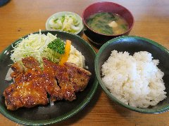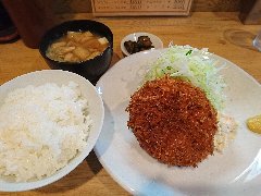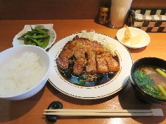 ![]() | 東十条駅北口から1分、駅から続く細い路地にあります。マンションの1階です。入口の半分は自販機に隠れていました。店内は、カウンター席が7つ、テーブルが3つありました。開店からけっこう賑わってました。ポークソテ定食(1200円)を注文しました。ライス、豚汁が付きます。ポークソテにはキャベツとマカロニが添えられます。大きな豚肉が2枚重ね、黒胡椒が掛けられ柔らかいです。ライスもけっこう大盛です。豚汁はキャベツたっぷりでした。ボリュームありました。美味しかったです。他の定食は、ロースとんかつ、ささみチキン、ウインナー、ハムカツなどがありました。 |