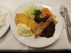 レストラン桂 | 洋食 | 東京都中央区日本橋室町 | ★★ (2017.2.10) | 小安 | ![]() | 三越前駅から1分、コレド室町のすぐ近くにあります。緑のテントが目印、表にメニューサンプルが並びます。昭和38年創業だそうです。店内は、テーブルが多数ありました。けっこうテーブルの間隔が狭いです。昼時は相席の可能性がありそうです。Aランチ(すずきのフライとポークソテーの盛合せ)(900円)を注文しました。すずきのフライはふわふわで美味しいです。酸っぱくないタルタルソースもいいです。ポークソテーにはロベールソース、ワイン強めデミソースのような感じです。キャベツの千切りとナポリタンも添えられます。ライスが付きます。これでこの値段は安いと思います。他には、ハンバーグ、ビーフシチュー、オムライスなど洋食メニューが揃っていました。 |