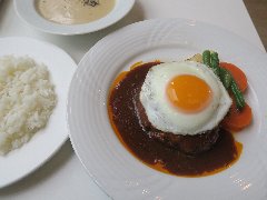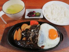 ![]() | 千代田線の町屋駅から1分、町屋交差点にあります。商業ビルの地下1階にあります。大きな看板が出ています。店内は、カウンター席が7つ、テーブルが5つありました。明るくてきれいです。ハンバーグランチ(950円)+目玉焼き(100円)を注文しました。7種類の手作りソースから選びます。ブラックデミグラスにしました。スープ、ライス、漬物が付きます。ハンバーグは熱した鉄板で出されます。けっこう厚みがあり肉汁が溢れてきます。ブラックデミグラスはベーコンと野菜から作るそうで、濃厚でコクがありました。間違いのない美味さでした。他には、ビフテキランチ、他のソースは、チーズ、トマト、ホワイト、和風ジンジャーなどがありました。 |