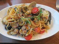 築地パラディーゾ | イタリア | 東京都中央区築地 | ★★ (2017.9.23) | 普通 | ![]() | 築地市場駅から4、5分、築地場外市場にあります。波除通り沿いにあります。マリンブルーの看板が目印です。予約表に記入すると店員さんが入店予想時間を教えてくれます。店内は、入口付近にはカウンター席とテーブル、奥の部屋にはテーブルがいくつかあります。入口付近はイタリアンぽい雰囲気、奥は青い壁で明るくてカフェっぽいです。ランチメニューから、本日入荷の貝類とチェリートマトのリングイネ(1680円)を注文しました。大盛りなサラダとパンが付きます。リングイネは、大量の貝とトマトが入っていました。貝は、ムール貝、あさり、しじみ、ハマグリ、ホタテなどがいっぱい入っていました。貝そのものも美味しいですが、旨味が出まくったソースが美味しいです。量は多めです。ちょっと食べにくいのは仕方なし。他には、地鶏と3種キノコの濃厚ラグーソースのスパゲッティ、魚介とチェリートマト、ズッキーニのレモン風味の漁師風リゾットなどがありました。 |