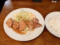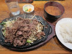 やまぐちさん | 洋食 | 東京都葛飾区青戸 | ★★ (2017.10.28) | 普通 | ![]() | 青砥駅から4、5分、駅から青砥平和公園に向かう途中にあります。変わった店名です。開店前に少し行列が出来ました。店内は、カウンター席が8つ、テーブルが4つありました。少し薄暗く配管がむき出し、裸電球っぽい照明でちょっと変わった雰囲気です。注文が入るとご主人が炎を上げながら手際よく動きます。その内、店内は煙が充満しました。焼肉野菜(972円)を注文しました。ライス、味噌汁、御新香が付きます。焼肉野菜は熱々の鉄板で出されます。キャベツ、モヤシ、ニラ、人参などの上に牛バラ肉がどっさり乗っていました。ボリューム満点で美味しいです。しかも安いです。テーブルにはニンニクが利いた特製ダレが置いてあり、これを掛けても美味しいです。他には、生姜焼き、ハンバーグ、エビフライ、和牛サーロインステーキなどがありました。また行きたくなります。 |