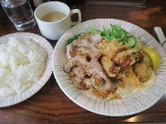 ![]() | 小伝馬町駅から3分ほど、江戸通りの鞍掛橋の交差点の近くの路地にあります。ビルの1階にあります。緑色の看板が出ていました。店内は、テーブルが多数、けっこう広いです。昭和な雰囲気でまったり感があります。割りと殺風景な内装です。ランチメニューのポークジンジャー・クリームコロッケ盛り合わせ(980円)を注文しました。ライス、味噌汁、サラダが付きます。ポークジンジャーは大きくて厚く柔らかいです。生姜のタレも程よいです。コロッケはカニ風味、タルタルソースが添えられていました。とても美味しかったです。そして安いです。他には、ハンバーグ、ナポリタン、焼きチーズカレーなどがありました。ややデカ盛り系のお店だったようです。 |