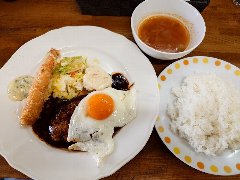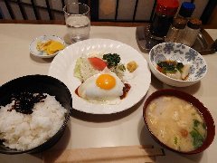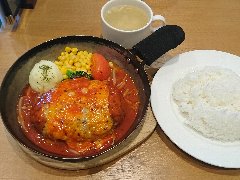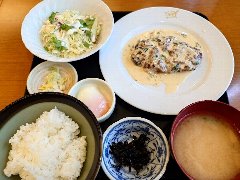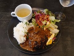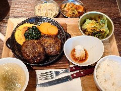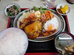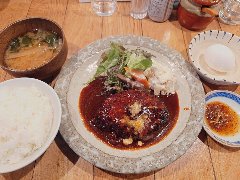 ![]() | 中板橋駅から3分ほど、中板橋商店街にあります。マンションの1階です。店内は、テーブルが8つありました。明るくてきれい、まあまあ広いです。ヘソハンバーグ定食温玉付(1150円)を注文しました。ヘソは中板橋のへそ祭りからきているようです。ライス、味噌汁、サラダ、佃煮、漬物、ドリンクが付きます。ハンバーグは牛肉の粗挽きでやや硬め、ほうれん草が入った白いソースが掛かっていました。味はしっかりしています。途中で温玉を追加するとマイルドになります。美味しかったです。他には、ナスみそのハンバーグ、バーグきのこのオムライス、鶏南蛮定食などがありました。 |