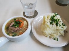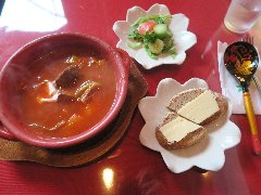 ![]() | 岩本町駅から2、3分、新幹線の高架下にあります。理容室と同じ入り口で理容室を抜けて裏道出ると階段があり、登った2階にあります。ちょっと入るのに勇気がいります。裏道からくれば階段から入れます。店内は、カウンター席が7つ、テーブルが2つありました。カウンターには水槽が置かれていました。意外とアットホームな雰囲気でした。席に座るとお茶と食前酒が出されます。ビーフシチュー(1200円)を注文しました。ご飯、サラダ、フルーツ、コーヒーが付きます。ビーフシチューには、牛肉の塊、後入れのジャガイモ、ニンジンが入っていました。とろりとして濃厚、そこそこ牛肉は柔らかかったです。美味しかったです。他には、ジャーマンオムレツ、サンマの開き、日替わり定食がありました。帰りにアメくれました。 |