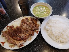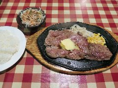 ![]() | 茅場町駅から2、3分、兜町の交差点の北西方向の狭い路地にあります。ビルの地下1階にあります。黄色い壁の外観です。店内はテーブルが多数ありました。赤いテーブルクロスが敷かれています。やや薄暗いですが雰囲気はいいです。メニューにはサイコロステーキ発祥の店と書かれていました。サイコロステーキ(180g)(1700円)を注文しました。ライス、サラダ、スープが付きます。熱々鉄板にサイコロステーキともやしとキャベツと人参、卓上のソースを自分で掛けます。牛肉は柔らかく旨味あります。ソースは醤油ベースでやや酸味がありました。肉とよく合います。美味しかったです。他には、牛肉スタミナ焼き、ポークジンジャー、洋風ハンバーグなどがありました。 |