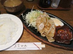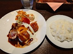 ![]() | 保谷駅北口から2分ほど、線路沿いの道を東に進むとあります。2階建ての建物の2階です。階段を登ると2つの入口があります。店内は、テーブルが多数ありました。和風と洋風の部屋があり和風の部屋にしました。やや薄暗く壁にはメニューはたくさん貼られていました。2品盛り合わせ(1000円)を注文しました。14種類のおかずから選べます。手ごねチーズハンバーグステーキ(200g)と国産若どりのチキンステーキ(150g)にしました。ライス、サラダ、スープが付きます。ハンバーグは俵型で柔らかいです。チキンは皮がパリパリでスパイシー、肉はジューシーで柔らかかったです。ボリュームありました。美味しかったです。そして安いです。他は、ポークステーキ、きむら風ローストビーフ、牛すじカレーのオーブンチーズ焼きなどがありました。 |