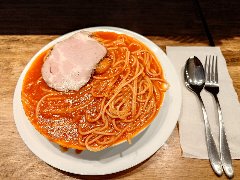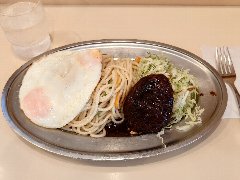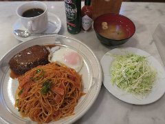 ![]() | 西新井駅西口から1分、駅の近くにあります。3階建てのビルの2階にあります。店内は、テーブルが多数ありました。かなり広いです。シャンデリアや大きなソファーが並びレトロな雰囲気を出しています。バーグナポリ(1050円)を注文しました。サラダ、味噌汁、ドリンク付きです。ライスも無料で付けられます。大皿にナポリタン、ハンバーグ、目玉焼きが乗ります。ナポリタンの具はベーコン、ピーマン、玉ねぎなど、パスタは細めでつるっとしていました。量も十分です。ハンバーグも厚みがありジューシーでした。美味しかったです。他には、各種ドリンク、オムライス、シルビア弁当、トースト、カレーライスなどがありました。座席が広く居心地がよかったです。 |