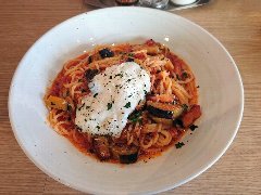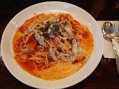 ![]() | 人形町駅から3分ほど、人形町通りを小伝馬町平面に向かい少し路地に入ったところにあります。ビルの1階です。ガラス張りの外観です。店内は、カウンター席が4つ、テーブルが5つありました。明るくてきれいです。割りとシンプルな内装です。メニューはとても多いです。特製しょうゆ味バター風味のナスとベーコン(1050円)を注文しました。醤油とバターの香りがそそります。ナスもベーコンも大きくてたくさん入っていました。スパゲッティの太めで量も多めです。バターが程よく効いています。美味しかったです。やや塩気が強かったです。ふりかけバジルでの味変もいいです。他には、煮込み系、カルボナーラ系、トマト系、ペペロンチーノ系などいろいろありました。店員さんは丁寧でした。人気店です。 |