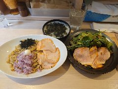 ![]() | 新日本橋駅から4分ほど、昭和通りの本町二丁目の交差点から路地に入ったところにあります。ビルの1階です。オレンジと白の外観です。店名は獅子に牡丹?だそうです。店内は、カウンター席が10、奥に細長く小ぢんまりしていました。明るくてきれいです。にぼセット(1300円)を注文しました。にぼたん、サラダ、にぼすいが付きます。サラダは春菊とレタスと焼豚でした。野菜は多めです。にぼたんは、岩海苔、うずら、焼豚、刻み玉ねぎが入っていました。パスタは太め、ソースは煮干しとバターなどが入っていました。絶妙にいい味でした。辛味のオリーブオイルを入れると味変します。にぼすいは煮干しとジャガイモのスープ状のもの、優しい味わいでした。美味しかったです。他には、ぺぺたん、トマたんなどがありました。 |