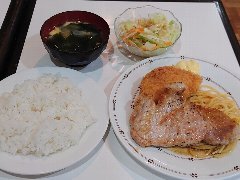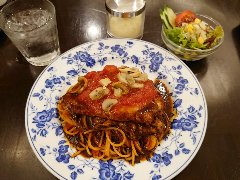 ![]() | 京橋駅から1分、京橋エドグランの地下1階の飲食店街にあります。ガラス張りの外観です。明治屋直営のお店のようで80年以上の歴史があるようです。店内は、カウンター席が5つ、テーブルが多数ありました。とても広くて席もゆったりしていました。やや殺風景ではあります。ポークピカタのパスタ(1250)を注文しました。土曜日には無いメニューですが作ってくれました。サラダが付きます。ナポリタン風のスパゲッティにトマトやマッシュルームたっぷりのポークピカタが乗ります。これに粉チーズをたっぷり掛けて頂きます。トマトの酸味とドミグラスソースの苦みが合わさり濃厚な味わいです。ポークはとても柔らかかったです。美味しかったです。他には、ハンバーグステーキ、ビーフのレアカツ、ビーフカレーなどがありました。 |