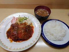![]() | 平和台駅から3、4分、環八通り沿いにあります。表にはメニューサンプルがあります。店内は、カウンター席が4つ、テーブルが7つありました。やや薄暗いです。メニューはけっこう多かったです。ハンバーグ定食(855円)を注文しました。ライス、味噌汁、漬け物が付きます。ご飯はけっこう多いです。ハンバーグには特製のデミグラスソースが掛かっていました。トマトっぽい酸味がありました。目玉焼きが付きます。ボリュームもあります。美味しかったです。他には、しょうが焼き定食、とんステーキ定食、ロースかつ定食などがありました。会計時に次回割引券がもらえます。 |