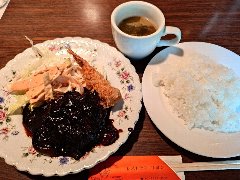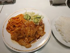 ![]() | 竹橋駅から1分、内堀通り沿い、駅に直結したビルの地下1階にあります。地下は飲食店街になっています。黒っぽい壁の外観、メニューサンプルがあります。店内は、カウンター席が多数、テーブルが5つありました。やや雑多な雰囲気があります。カレーのお店ですが洋食メニューが多いです。ポークソティージャポネーズ(1150円)を注文しました。ライス付きます。豚肉のソテー、ナポリタン、サラダが乗っていました。濃いめの甘じょっぱい生姜タレでご飯が進みます。ボリュームもありました。美味しかったです。他には、カツカレー、シュリンプピラフ、平目のフライ、ナポリタン、ハンバーグ、ポークカツなどがありました。賑わっていました。 |