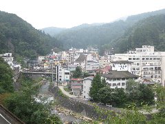 しばらく走ると山間に土湯温泉の温泉街があります。