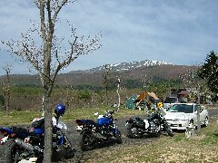 草津高原キャンプ場の朝 (バイク3台とサポートカー?1台) |
