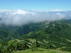 横手山山頂からの景色 (雲の上に北アルプスが見えます) |