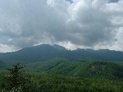 上高地乗鞍林道、白樺峠からの乗鞍岳 (8月なのに山頂付近に雪が見えます) |