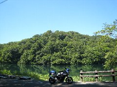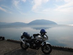 静かな十和田湖とバイク (島のように見えるのは御倉半島) |
