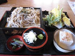 たくみの里、「ふれあいの家」の天ぷら蕎麦 (新鮮トマトはサービスです) |