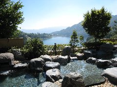 猿ヶ京温泉、「まんてん星の湯」の露天風呂 (眼下には赤谷湖です) |
