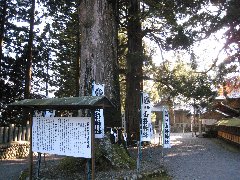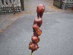 | 「村の茶屋」のざる蕎麦 | 山住神社の山住杉 | 山住神社前にある「大杉」の串いも | 天竜スーパー林道からの景色 (南アルプス方面ですがモヤってる) |