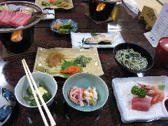 | 新平湯、「お宿のざわ」の貸切露天 | 新平湯、「お宿のざわ」の夕食 (左奥は飛騨牛!) |