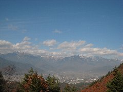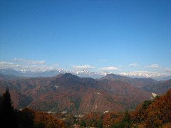 | 大峰高原へ向かうの林道からの北アルプス | 紅葉のトンネルのような林道 | 大峰高原からの北アルプス (眼下は大町の市街です) |