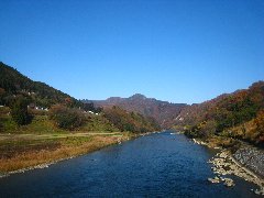 | 常念岳の麓、「ほりでーゆー虹の郷」 | 紅葉の烏川 (晴れてれば常念岳が見えるらしい) |