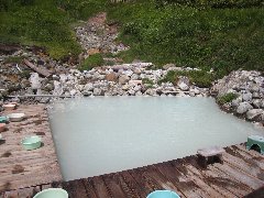 | 須川湖と秣岳 | 国道398号からの小安峡方面の景色 | 大湯温泉、「阿部旅館」の露天風呂 | 「阿部旅館」の天然の川風呂 (かなり熱いです) |