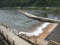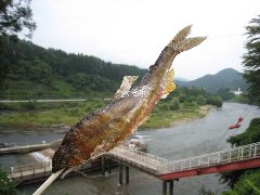 | 道の駅「白鷹ヤナ公園」、最上川の巨大ヤナ | 道の駅「白鷹ヤナ公園」、「あゆ茶屋」の鮎の塩焼き | 白鷹、「熊屋」のもりそば | 県道232号、板谷峠付近の景色 (かなり山奥です) |