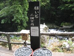 初景滝の近くの河原にある願い石 (奥に見える願い石の上にある的に小石を投げて入れば願いが叶う) |