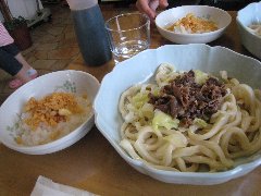 「山のうどん屋」の肉ぶっかけうどん | 「山のうどん屋」からの景色 (畑の向こうには甲府盆地) |