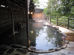鎌先温泉、「木村屋旅館」の露天風呂 (茶色っぽい濁り湯です) |