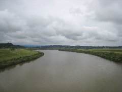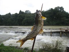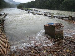 朝日村、三面川に作られた「布部やな場」 (雨のせいで水量が多くてちょっと怖いです) |