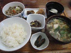 「伝承園」のけいらん定食 (けいらんとは茹でた餡子餅です(右上)) |