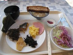 会津若松、「センチュリーホテル」の朝食 (茶碗の乗っているのは昨日のロースかつ) |