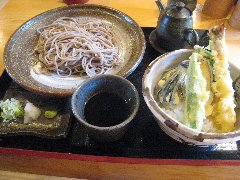 会津下郷、「農家レストラン 蕎屋」 | 「蕎屋」のもりそばとミニ天丼 (蕎麦、米、野菜は自家製だそうです) |