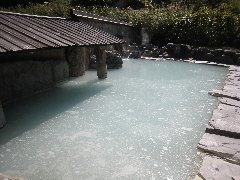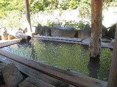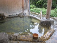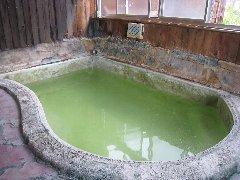 国見温泉、「石塚旅館」 | 「石塚旅館」の露天風呂 (不思議な緑色をしています) |