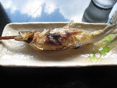 最上町、「ヤナ茶屋もがみ」の鮎の塩焼き | 「ヤナ茶屋もがみ」の裏に流れる小国川 (最上川の支流です) |