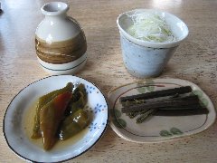 大石田、「そば切り 源四郎」の付出し (付出しのししとうとワラビ) |