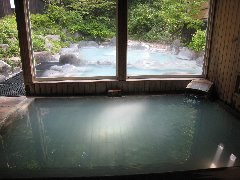 蔵王温泉、「源七露天の湯」の内風呂 | 「源七露天の湯」の露天風呂 (若干白く濁っています) |