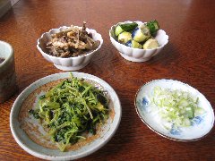 「源蔵そば」の付出し (お浸し、煮物、漬物、美味しいです) |